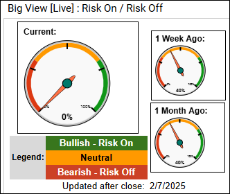 - Risk Gauge went to 100% risk-off as both gold and bonds firmed while the key U.S. stock indexes lost relative strength. (-)