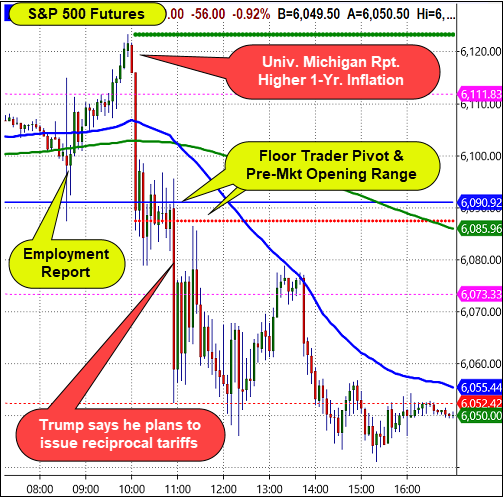 Traders familiar with the MarketGauge framework for trading intra-day price action will find the day’s pattern familiar. The condition of consolidation near both the Floor Trader Pivot and the Opening Range Low, followed by a breakdown, is a reliable trend day (down) pattern. Friday, the breakdown was a response to Trump announcing that he plans to issue additional reciprocal tariffs